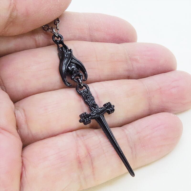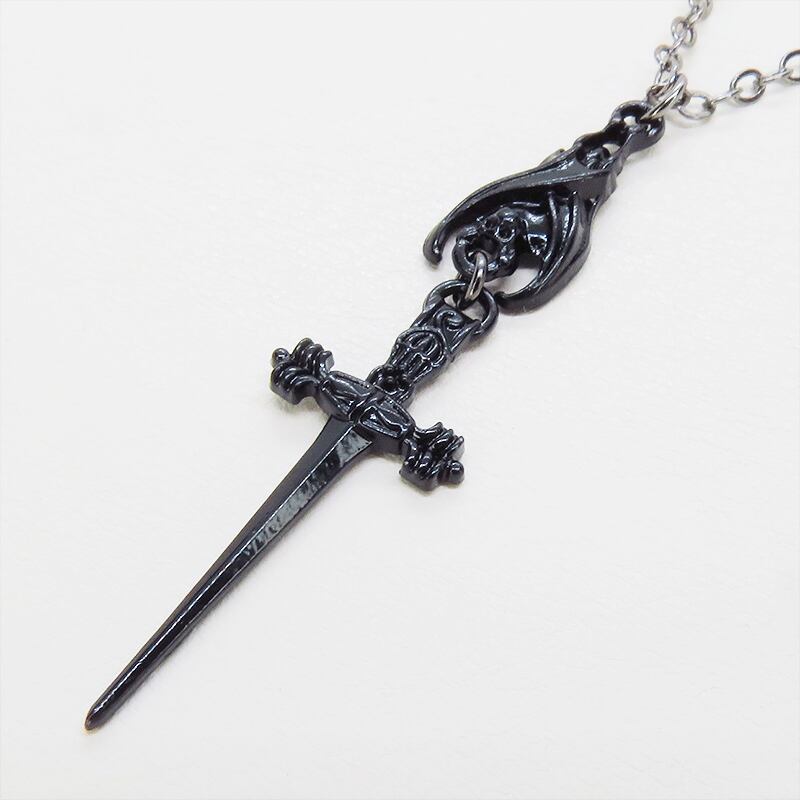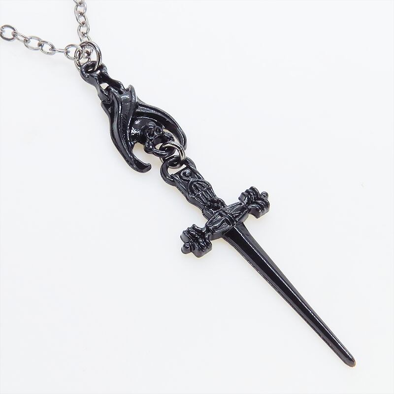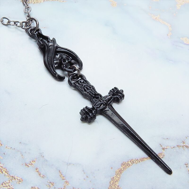 翼を休めるコウモリから一振りの剣へと真っ直ぐに伸びるシルエットが、スリムなネックレスとして縦のラインを強調し、首元をすっきりとスマートに映し出します