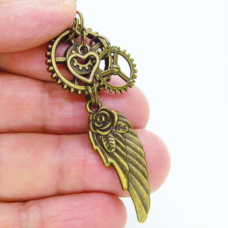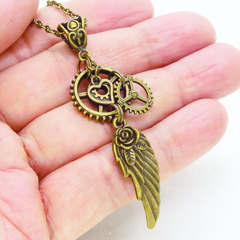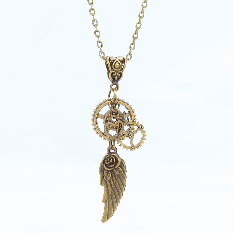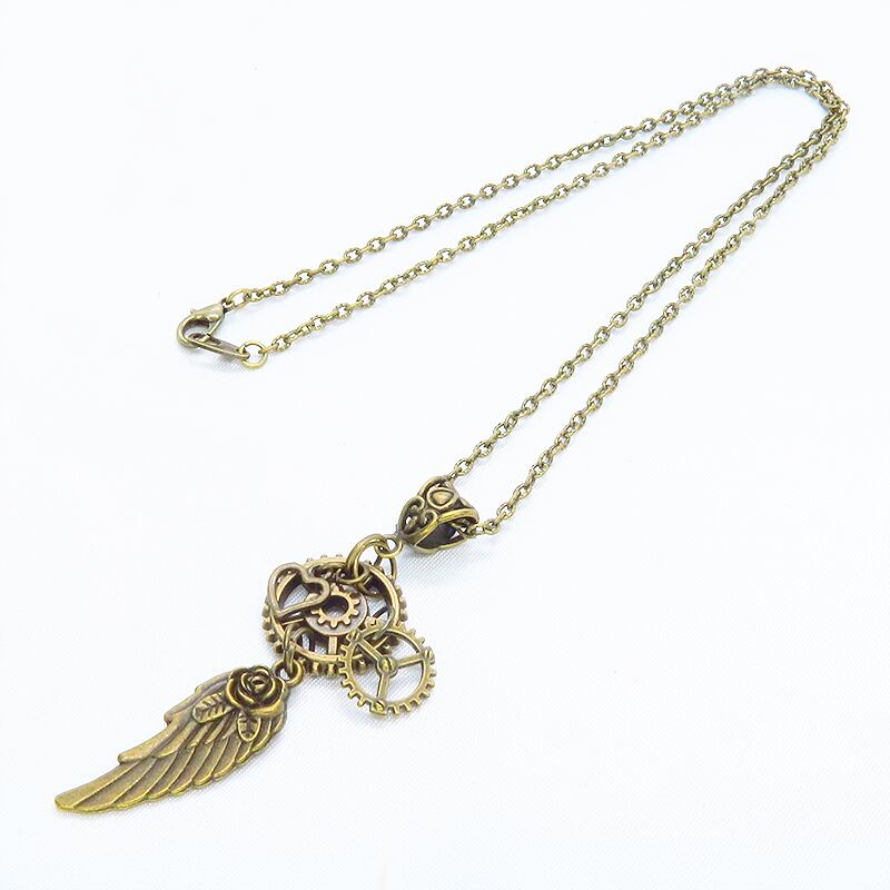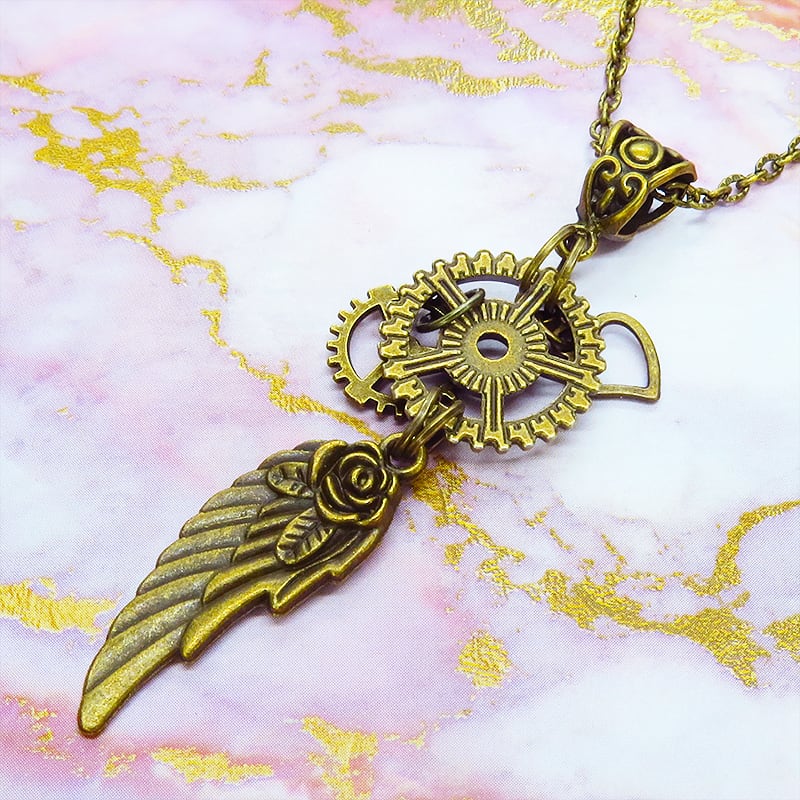 翼のモチーフと大小形状の異なる歯車を組合せたスチームパンク風のネックレスです