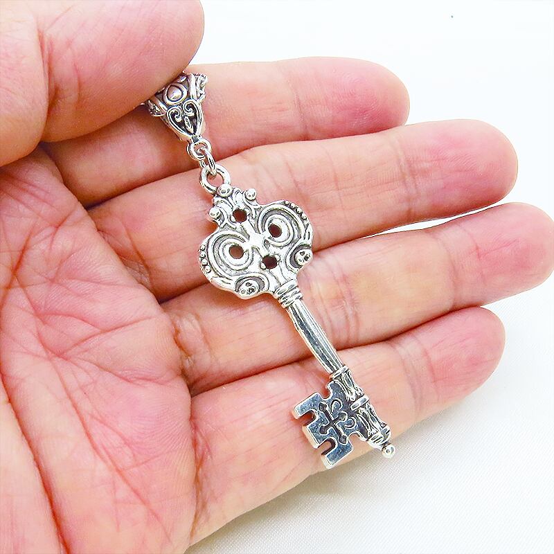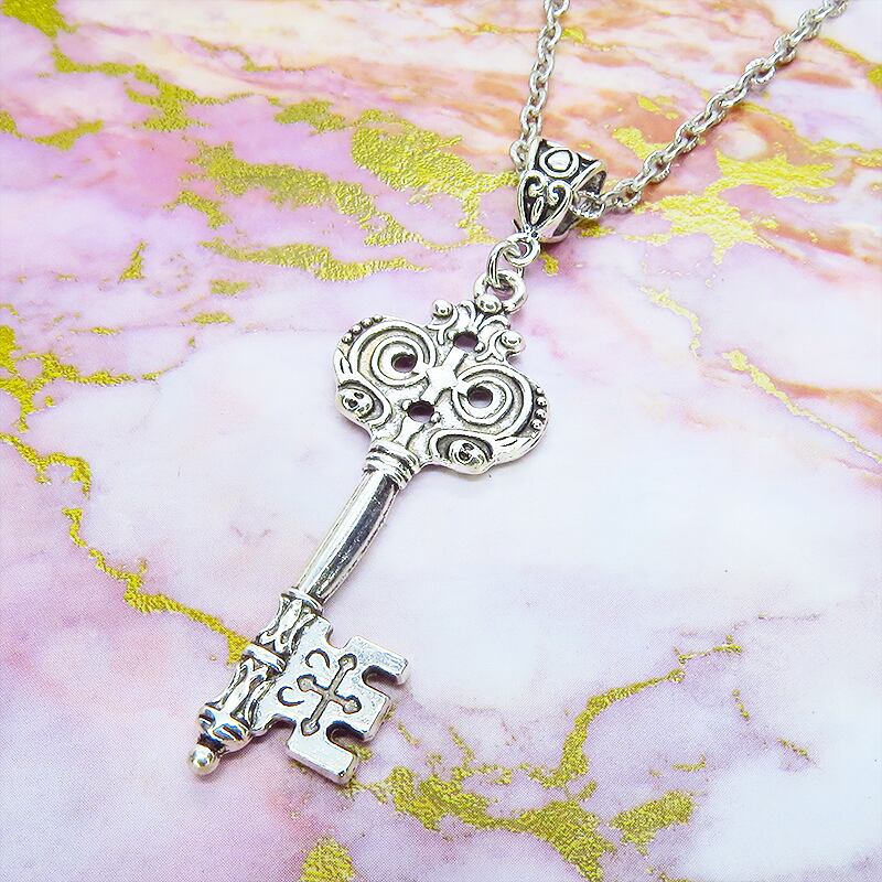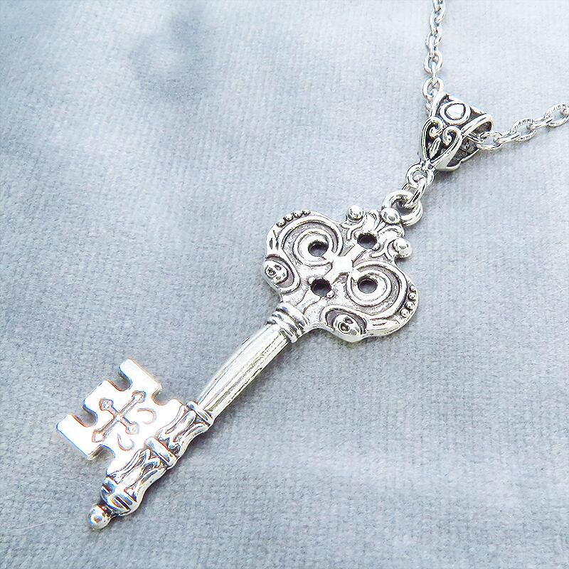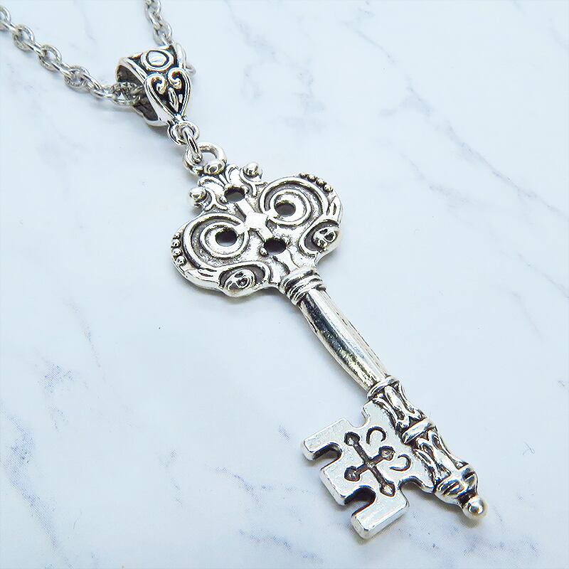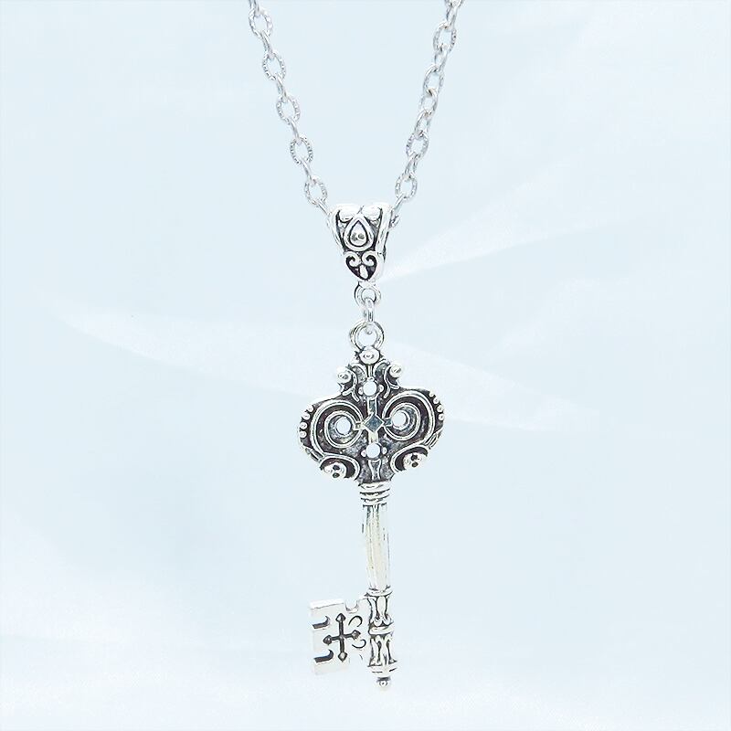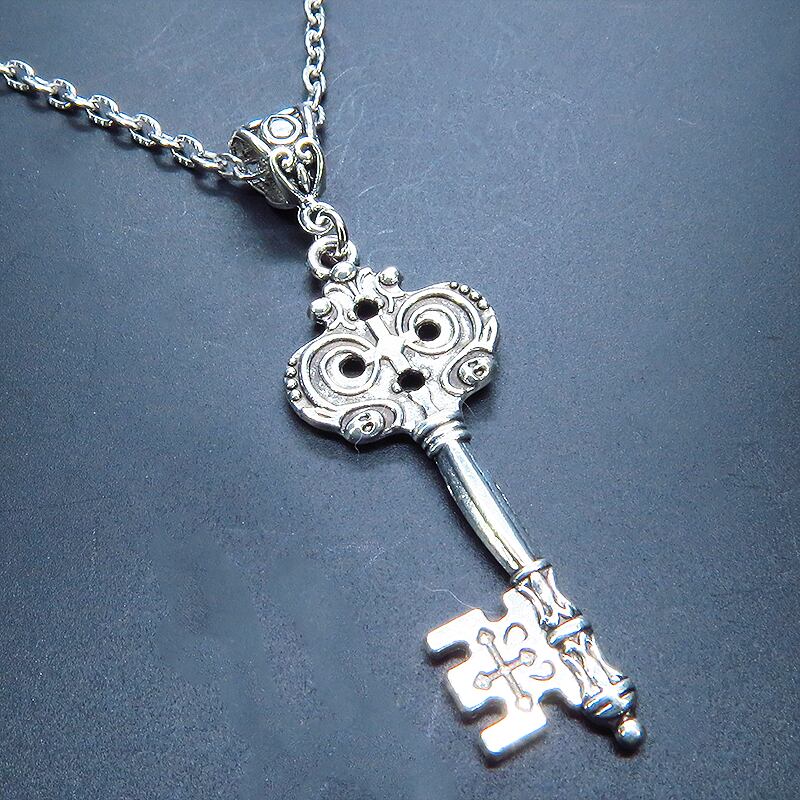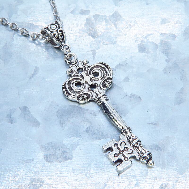 深みのあるアンティークシルバーカラーを基調とし、中世の古城で使われていたような重厚なゴシック調のカギモチーフを主役に据えたペンダントです