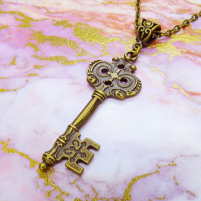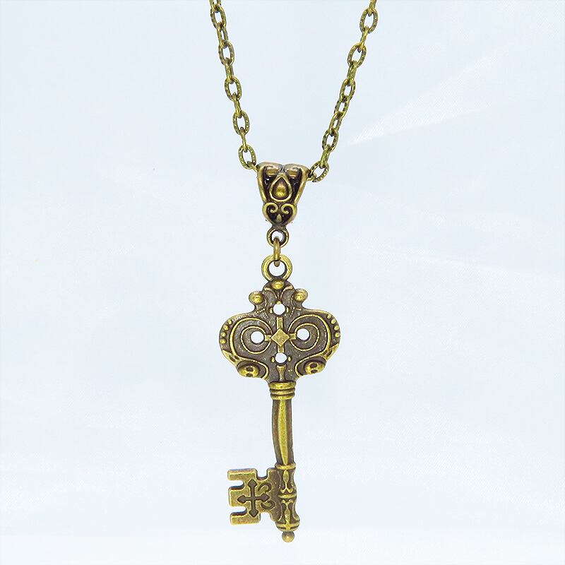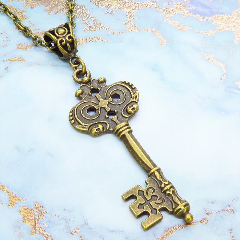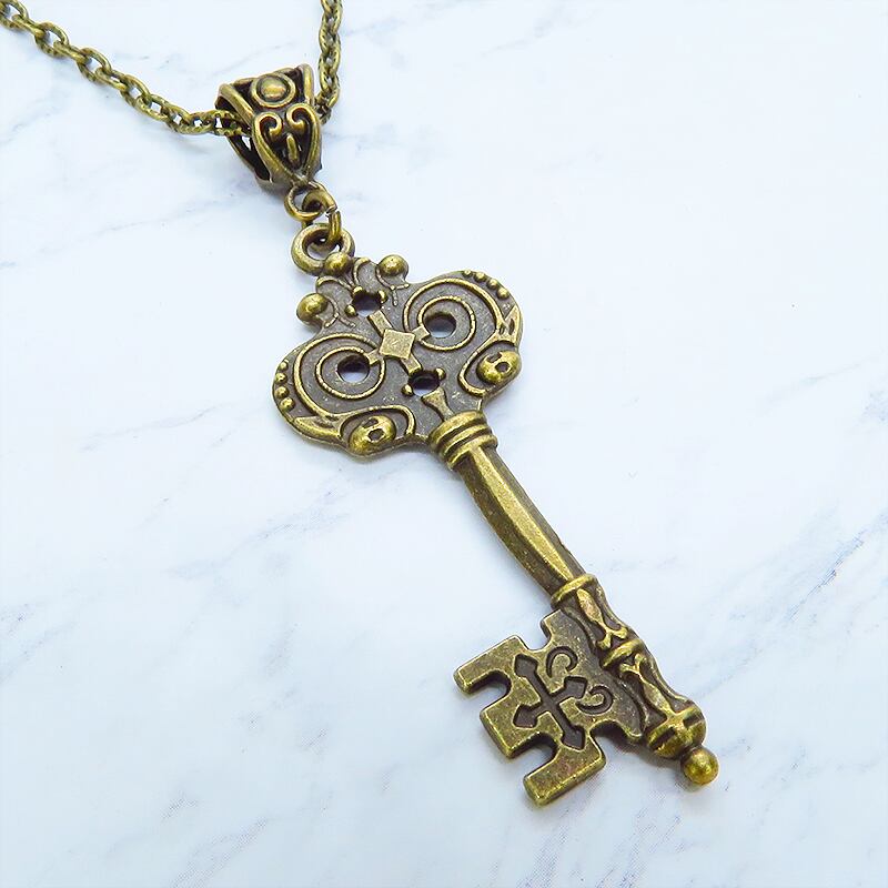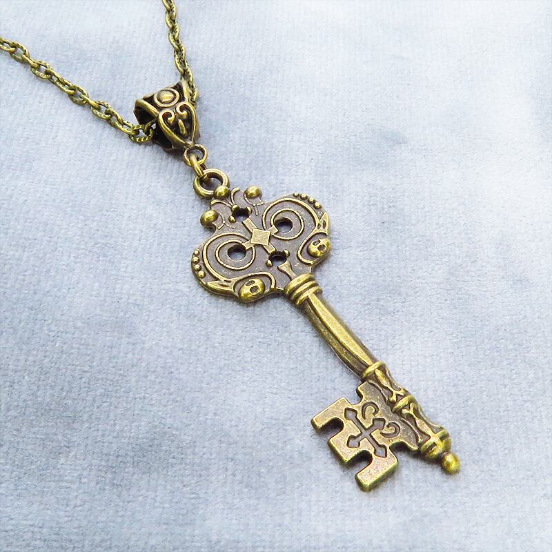 深みのあるアンティークゴールドカラーをまとい中世の古城で密かに使われていたような重厚なゴシック調のカギモチーフを主役に据えたペンダントです