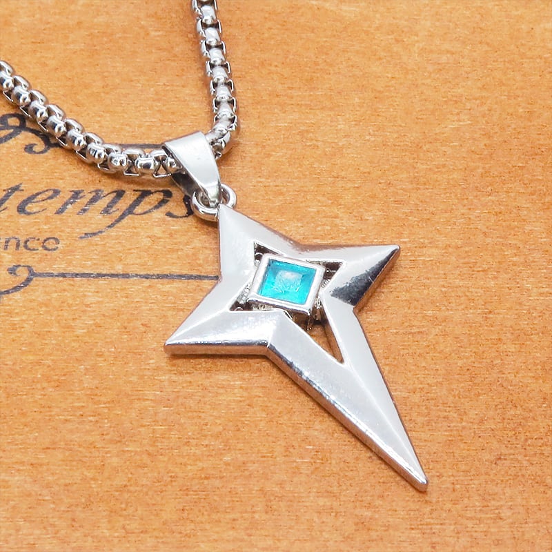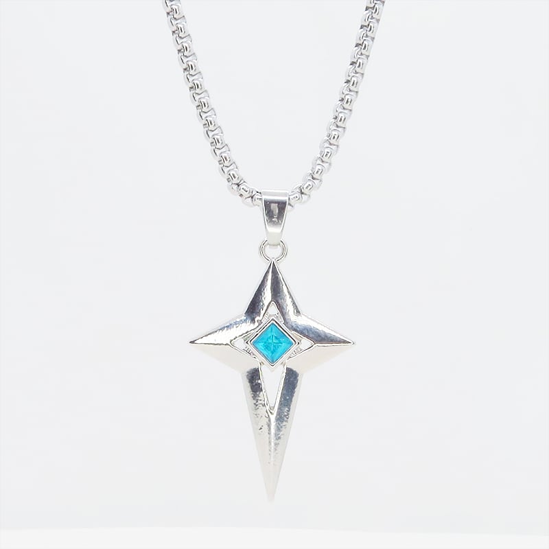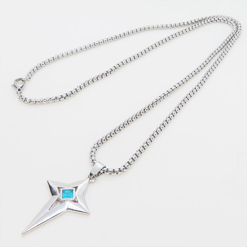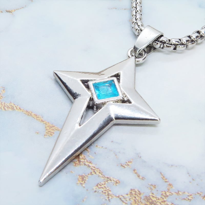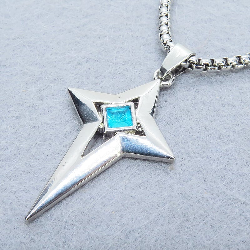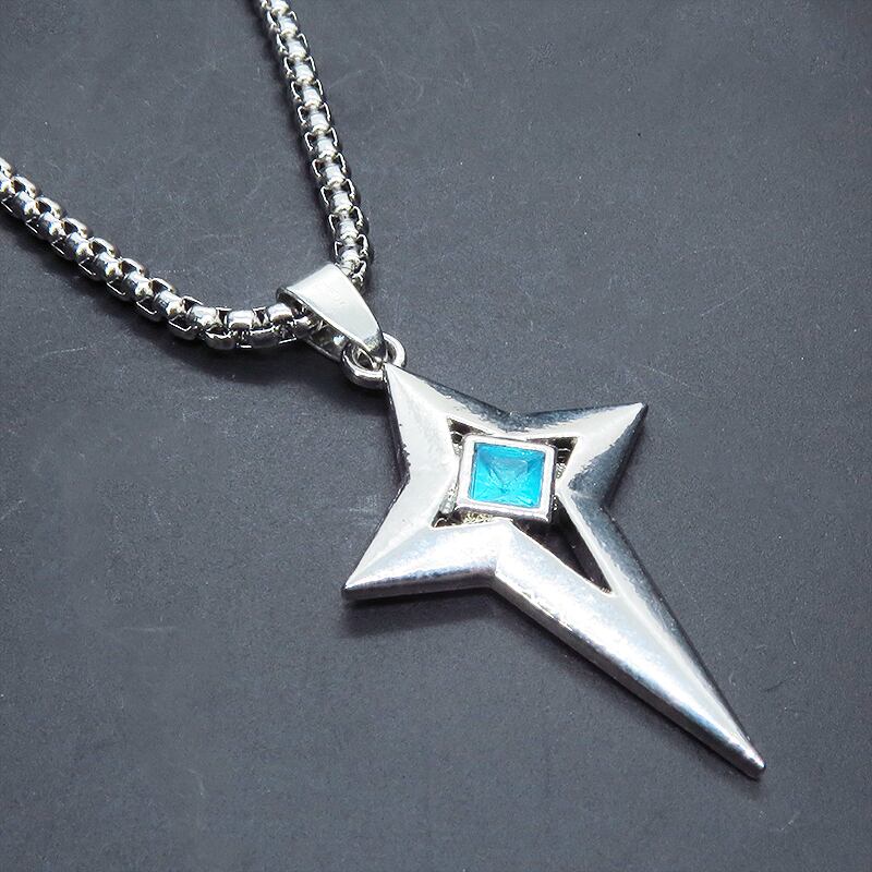 シャープな輝きを放つシルバーカラーの十字の星、楔形のクロススターを主役に据えたペンダントです