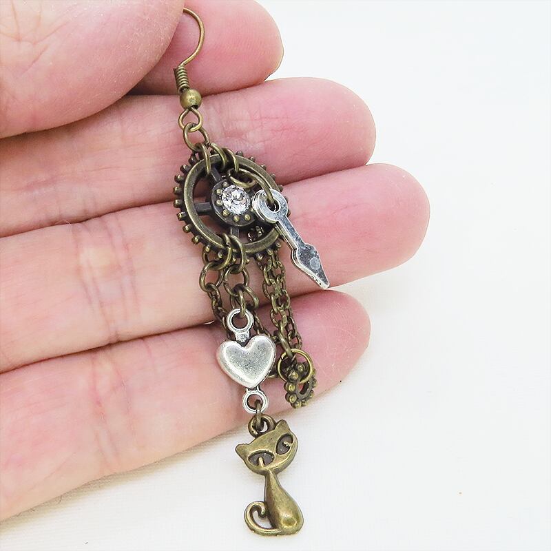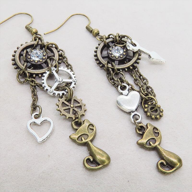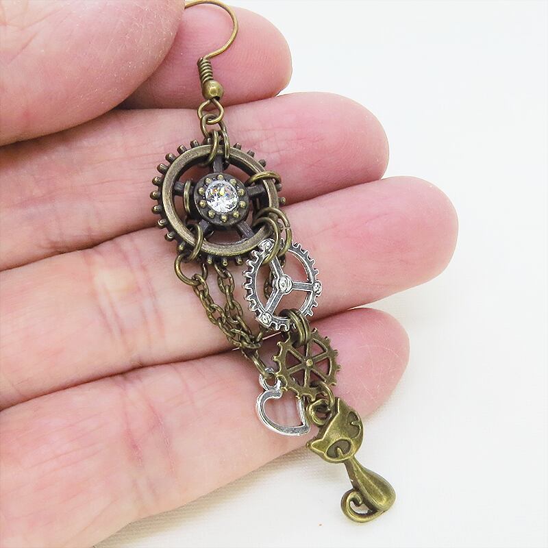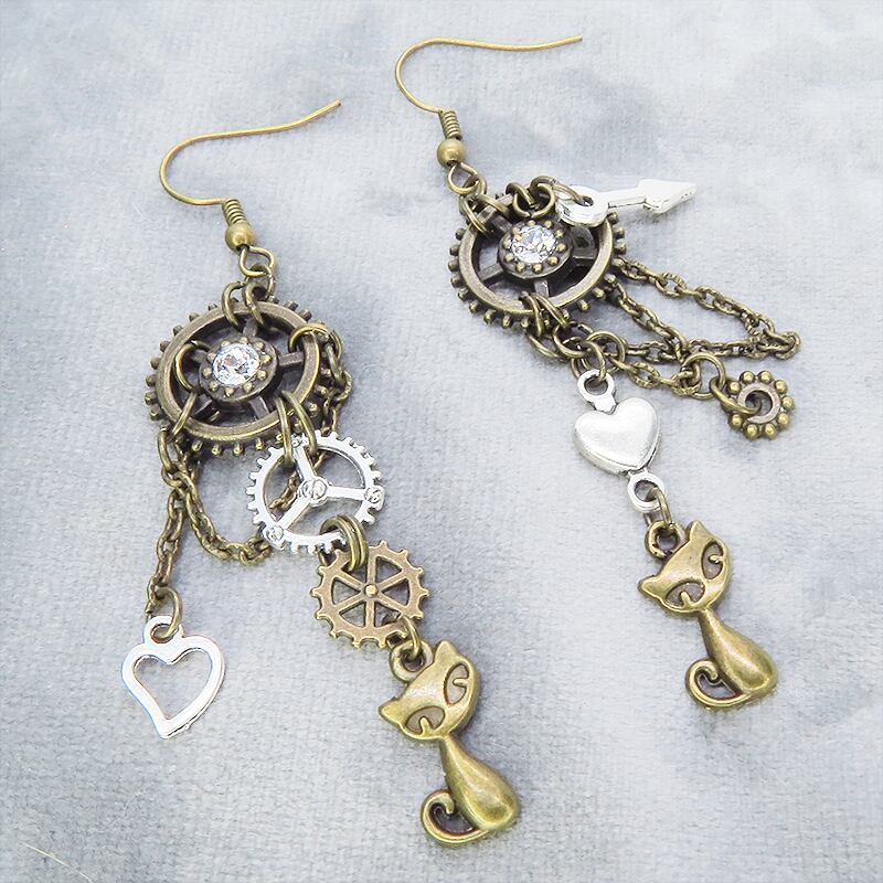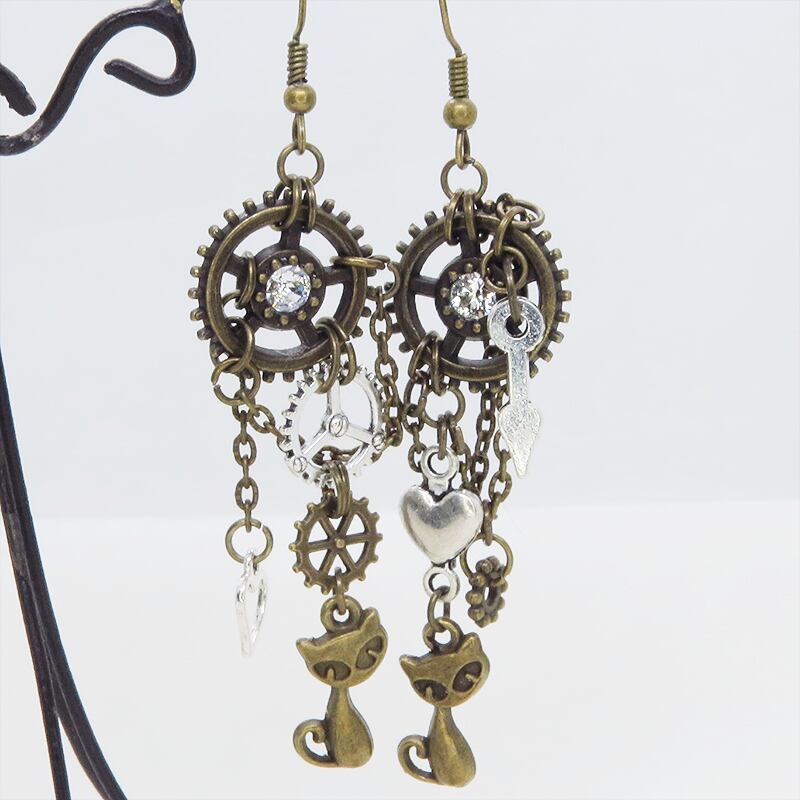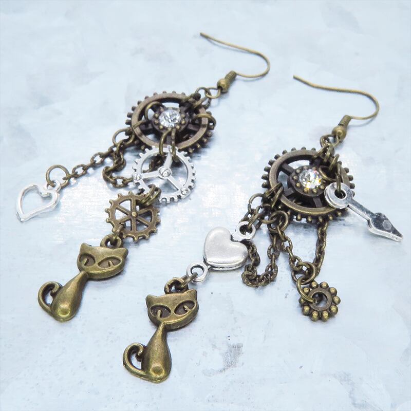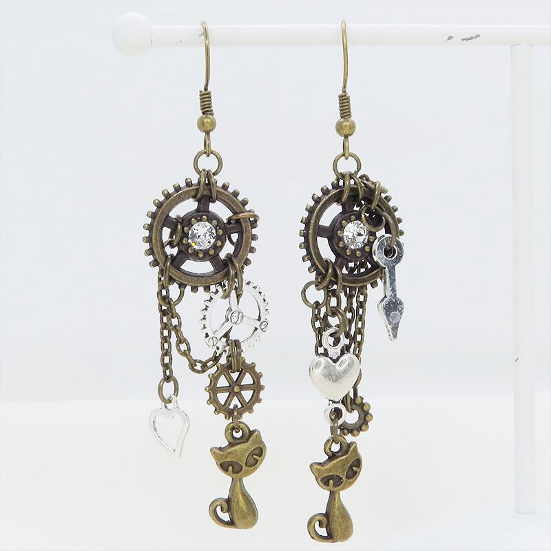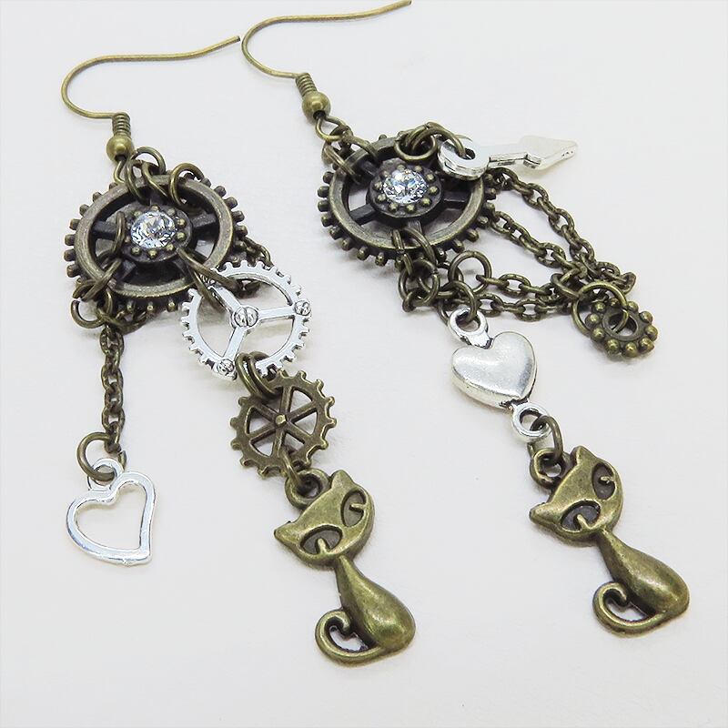 時を刻む機械仕掛けのようなアンティークゴールドの歯車と愛らしい猫のシルエットを組み合わせたスチームパンク風のピアスです