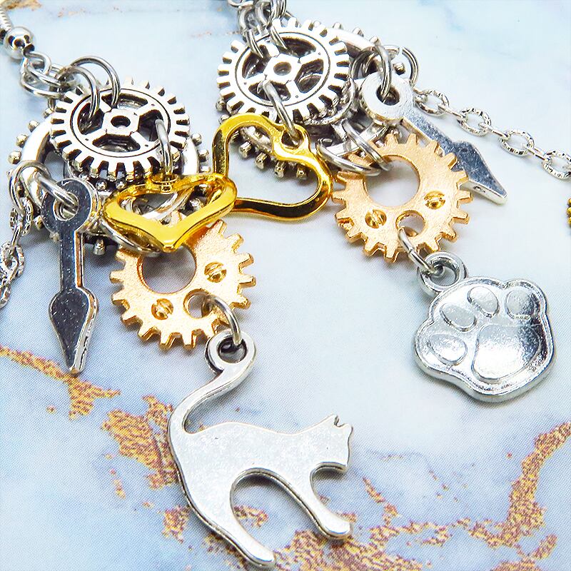 ご使用後は、柔らかい乾いた布で皮脂や汚れを優しく拭き取ってください。複数の歯車や繊細なチャーム、細いチェーンを組み合わせた複雑な多層構造になっておりますので、着脱の際の引っかかりや強い衝撃には十分ご注意ください。アンティーク調の落ち着いた風合いを長く保つため、水濡れや汗、化粧品との接触を避け、湿気の少ない場所で大切に保管することをおすすめします