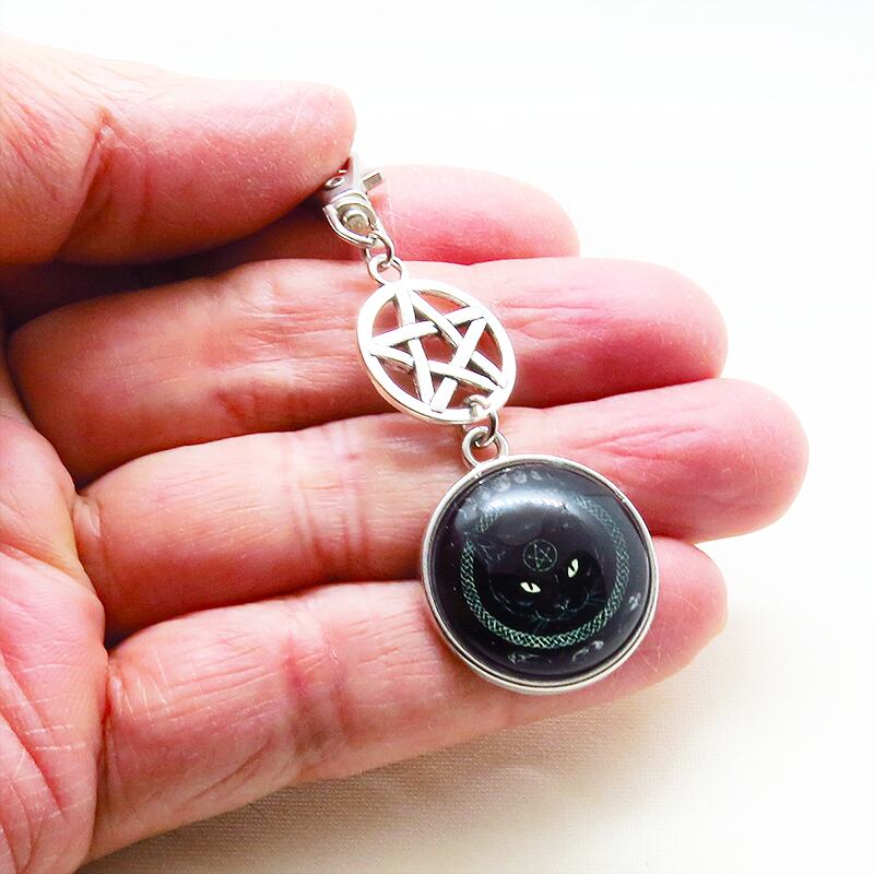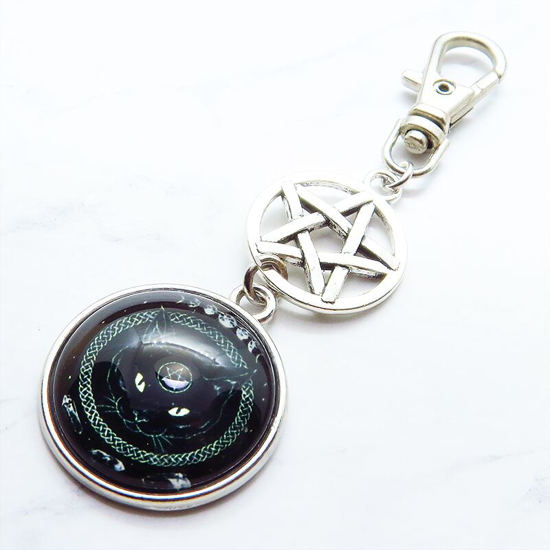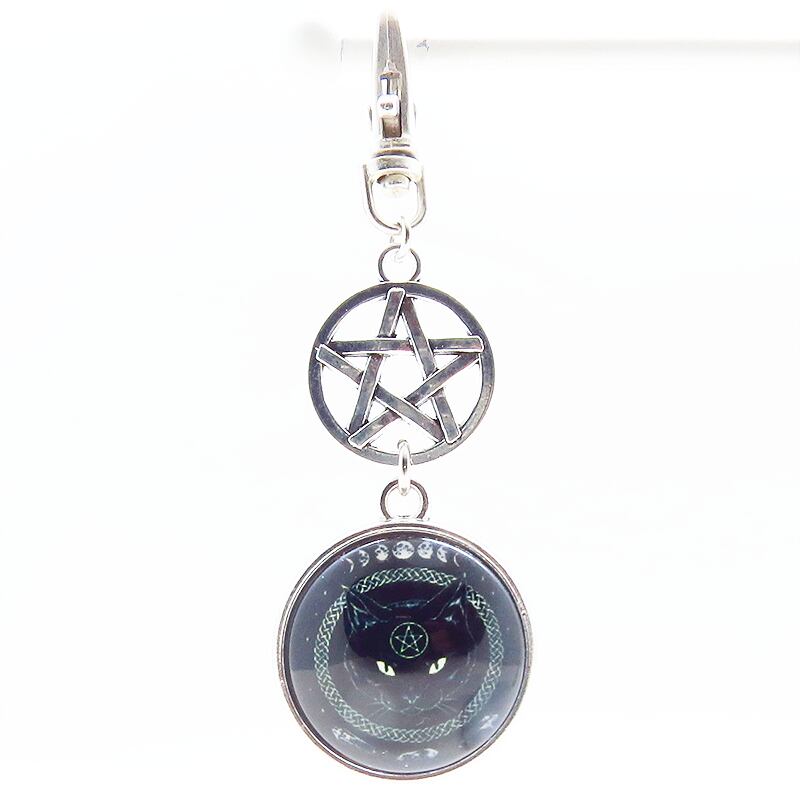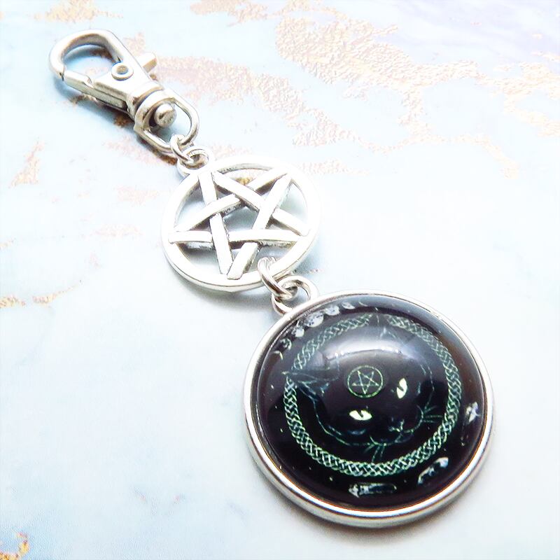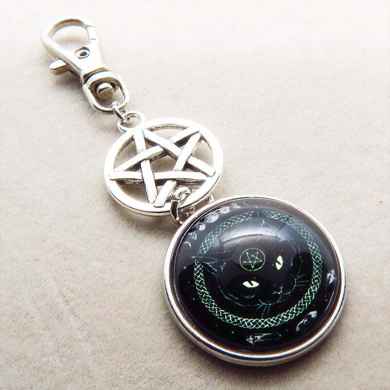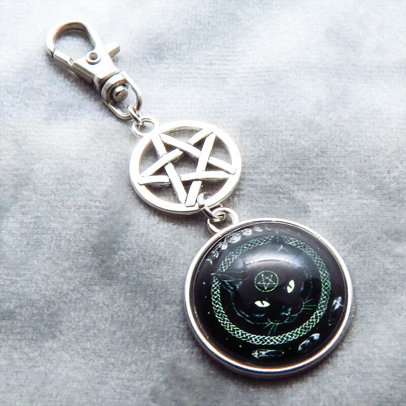 漆黒の毛並みの中に、ペンタグラム(魔法陣)を額に持つ黒猫の姿を封じ込めたカボションキーホルダーです