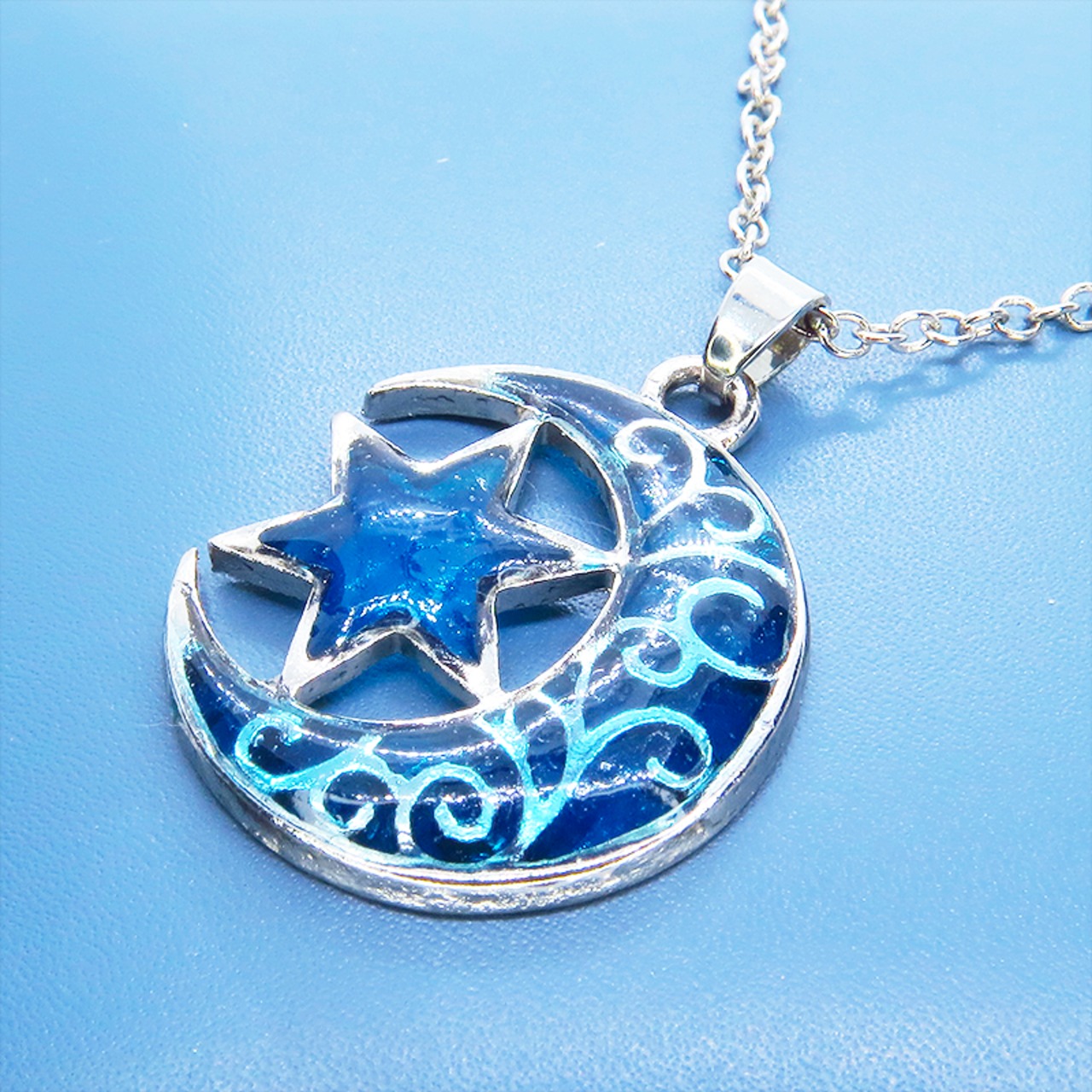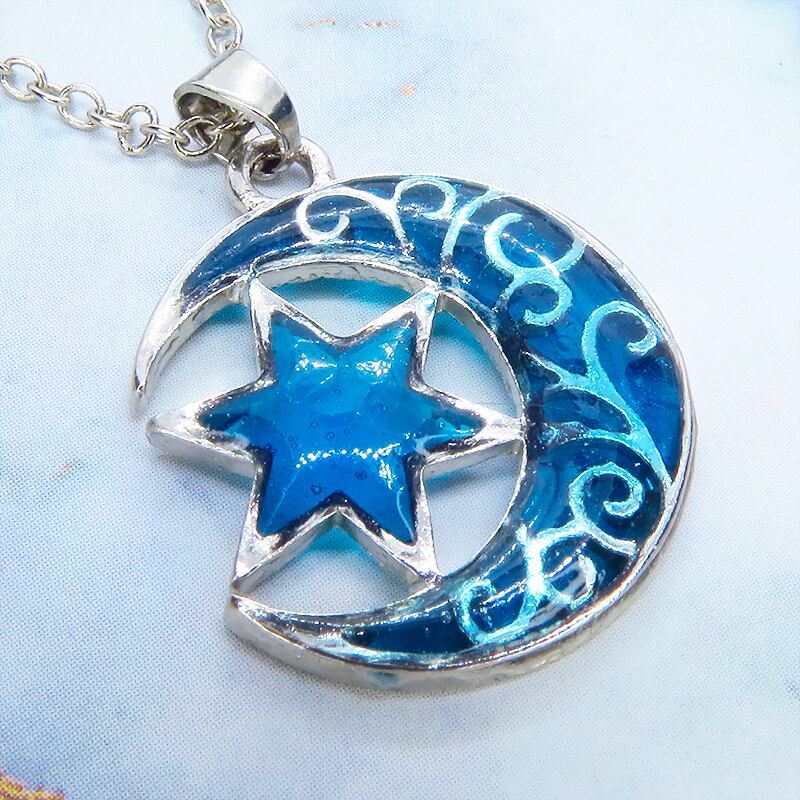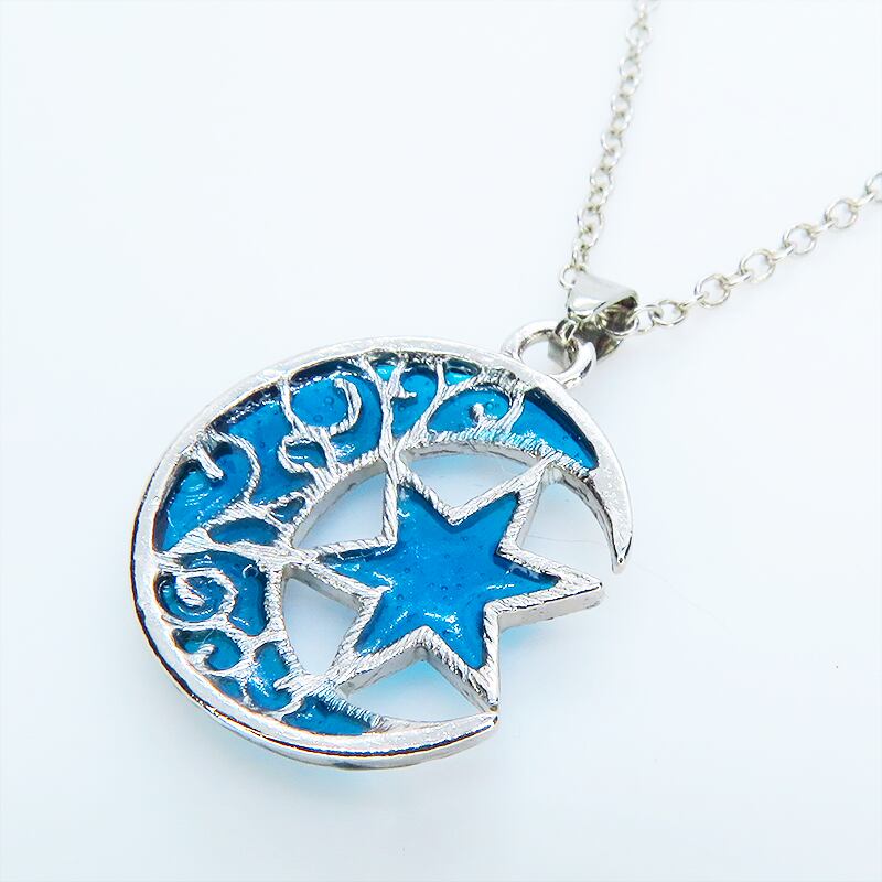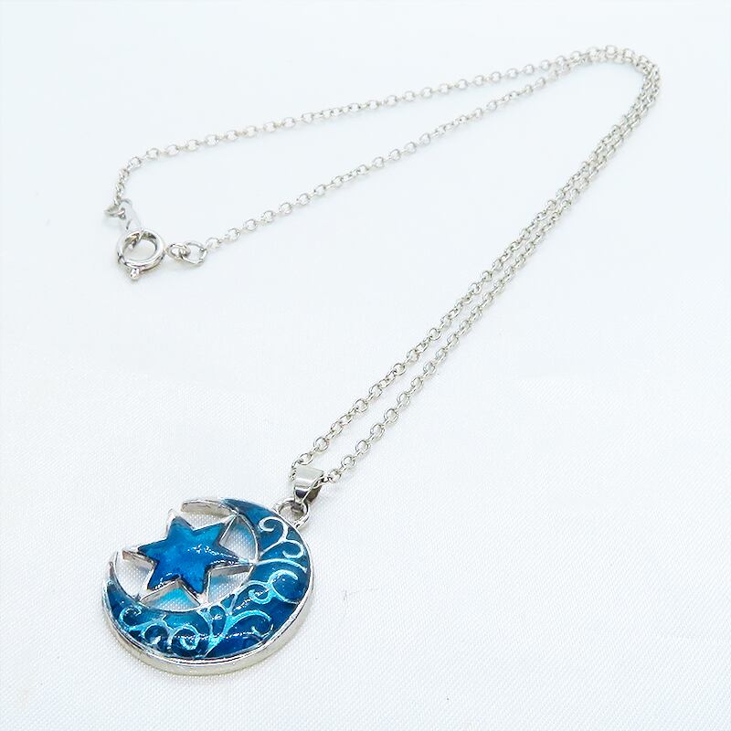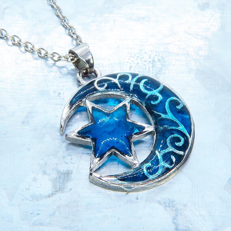三日月と星のモチーフにはブルーカラーのレジンにて彩色を施し、まるで宝石のように透き通るブルーの輝きを再現しました