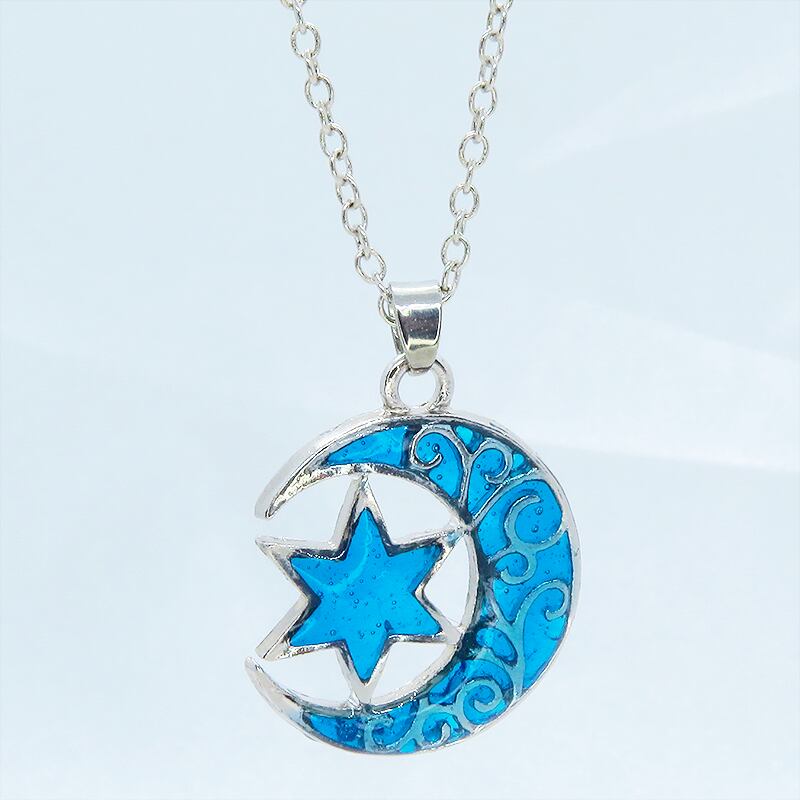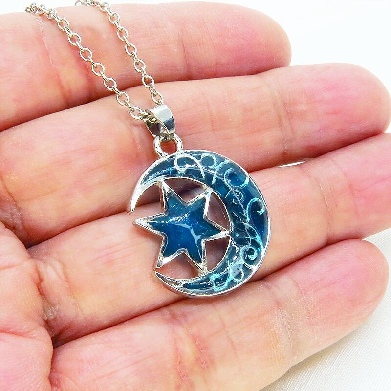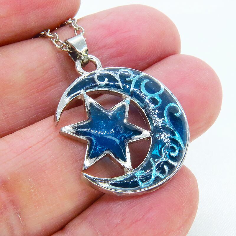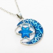凛としたアンティークシルバーのアラベスク調(唐草)の透かし模様が入った、三日月と星の組み合わせのモチーフを主役にしたネックレスです
