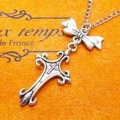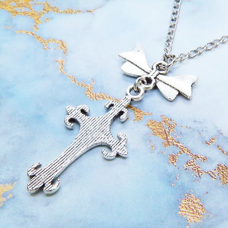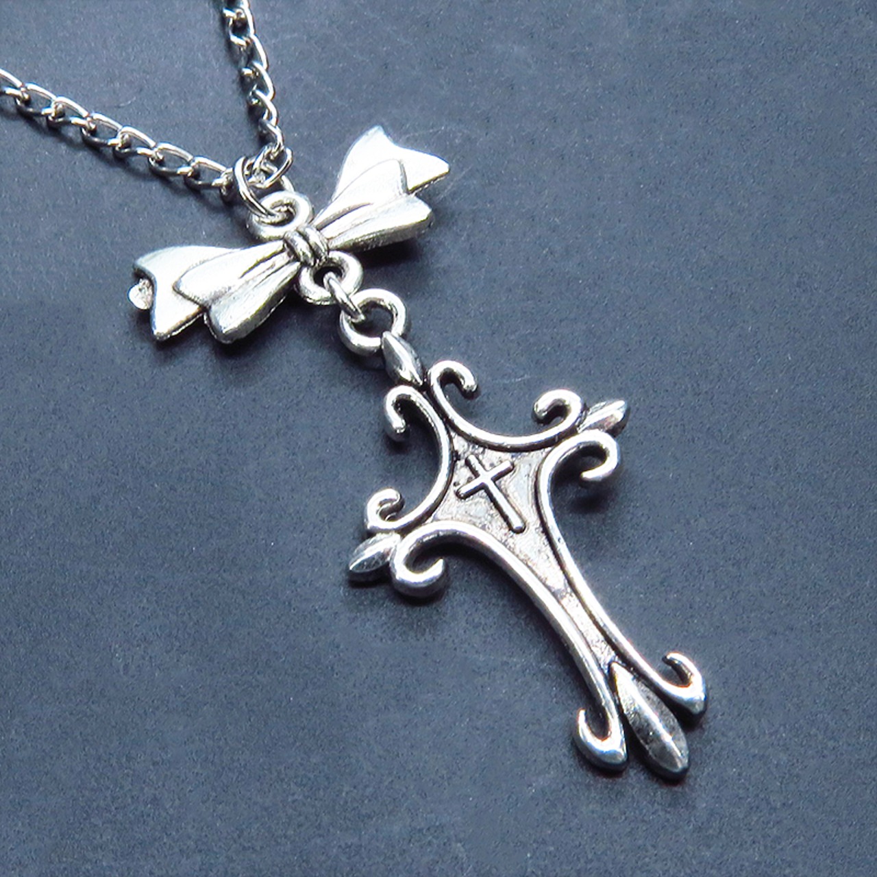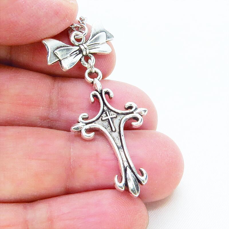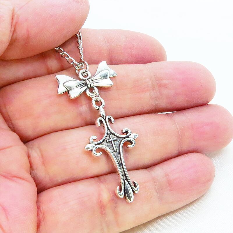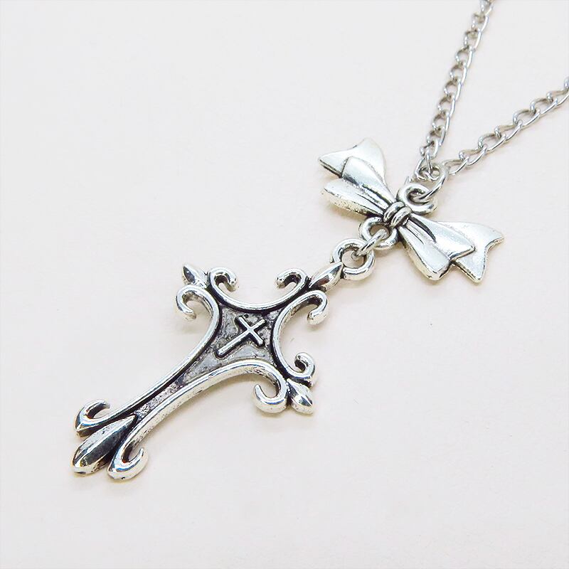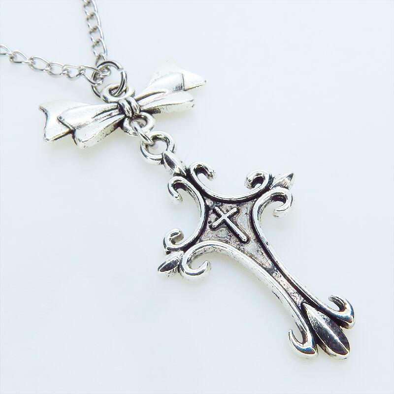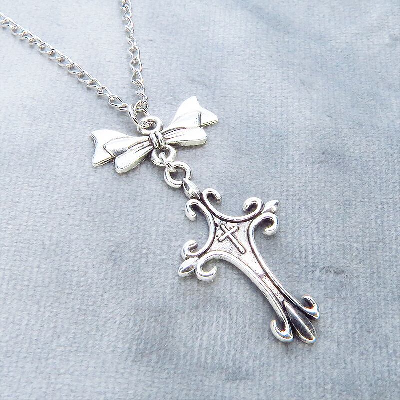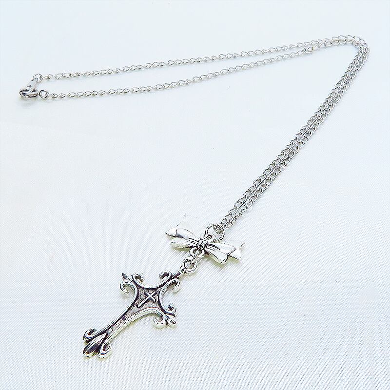 胸元にゴシック調デザインのロザリオ(十字架)とリボンを組合せたペンダントネックレスを添えて、あなただけの物語を始めてみませんか