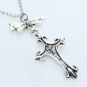 アンティークシルバー ゴシック調デザインロザリオ(十字架)とリボンを組合せたネックレス 長さ調整可 ステンレス可