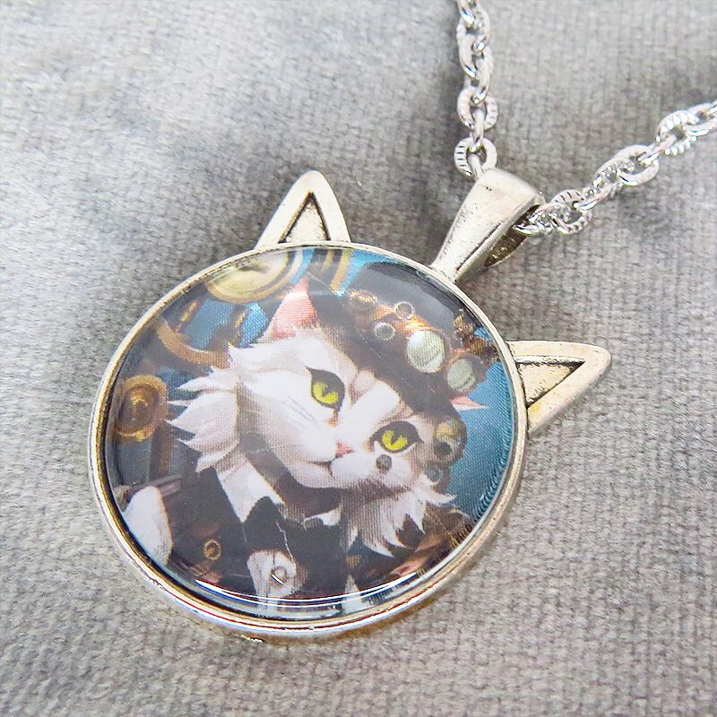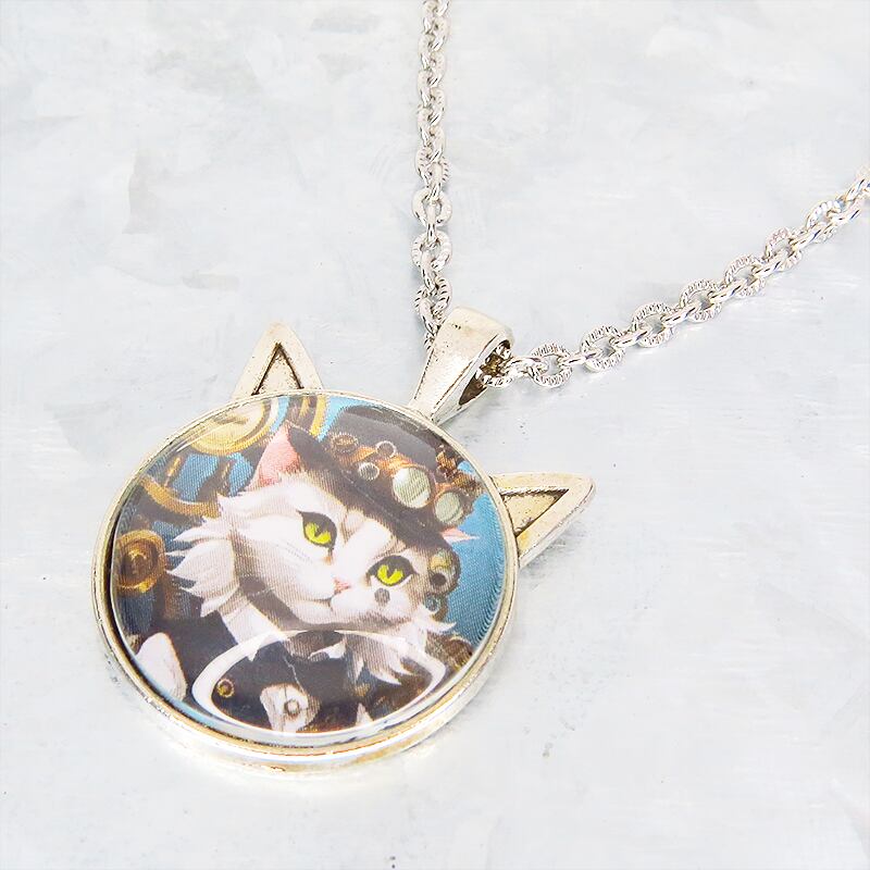 凛としたシルバーカラーのフレームにシルクハットを被った白猫のスチームパンクイラストを使った猫耳型カボションペンダントネックレスです