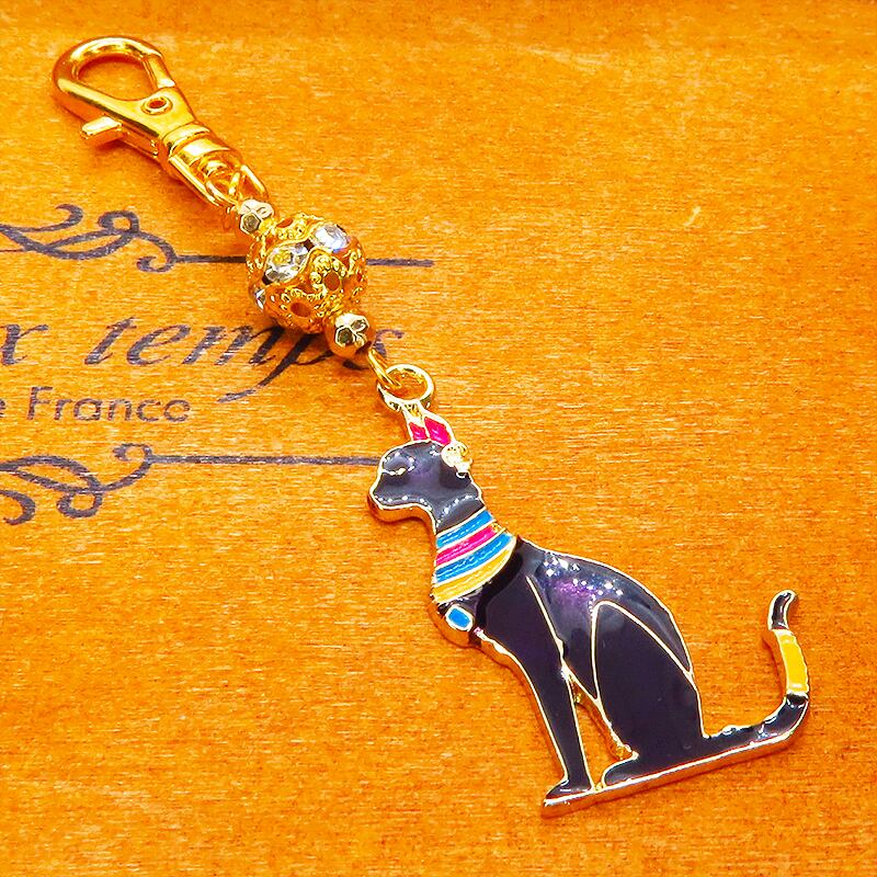 古代エジプトの猫の神様バステトのキーホルダー 黒猫 エナメル ゴールドカラービーズ 金具変更可