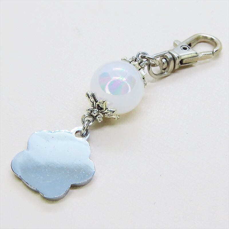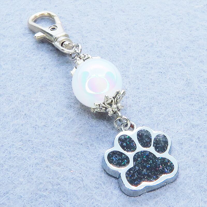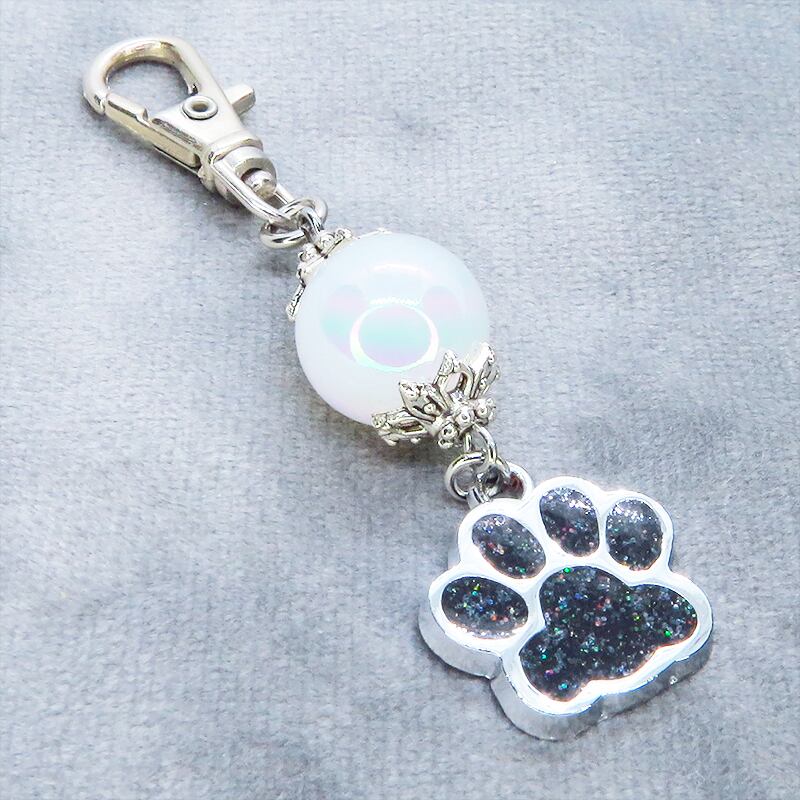 シルバーカラー 大きめ肉球チャームとクリアホワイトのビーズを組合せたキーホルダー 金具変更可