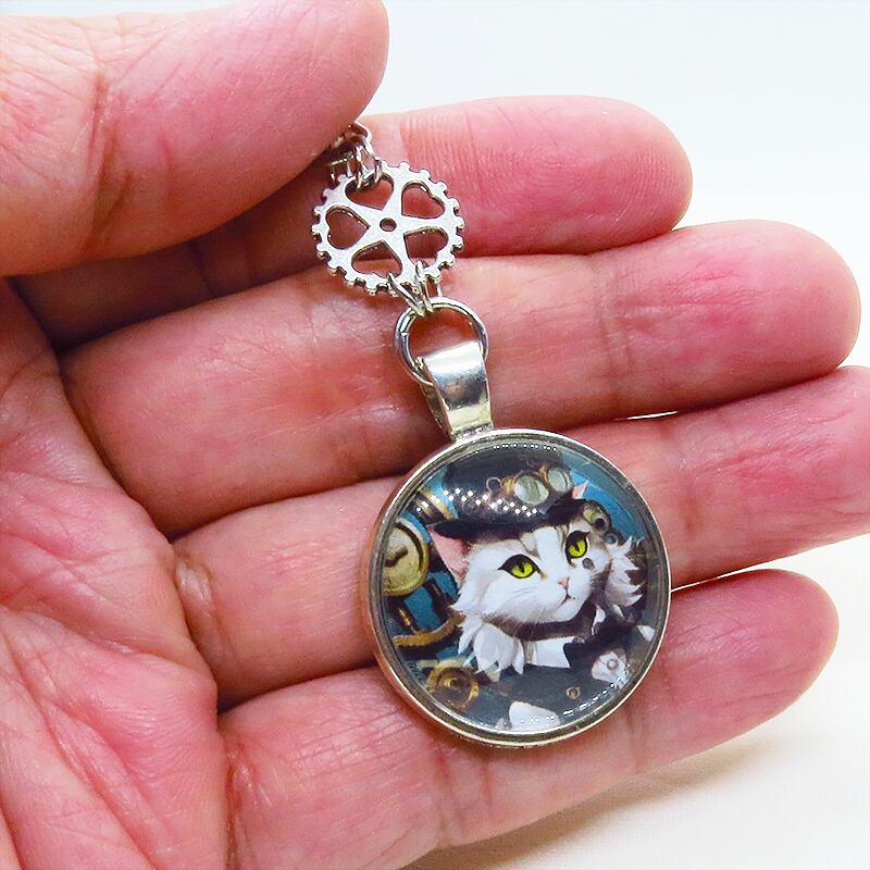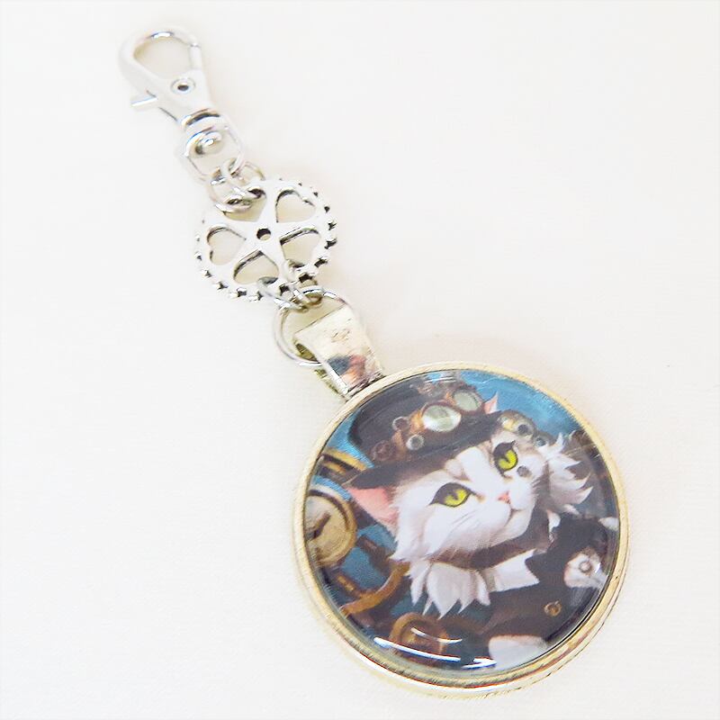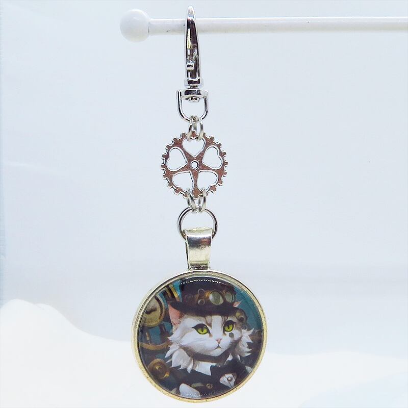 シルバーカラー カボションペンダント キーホルダー スチームパンク シルクハットの毛長白猫 金具変更可