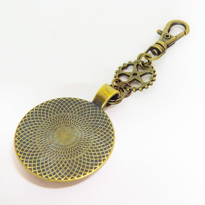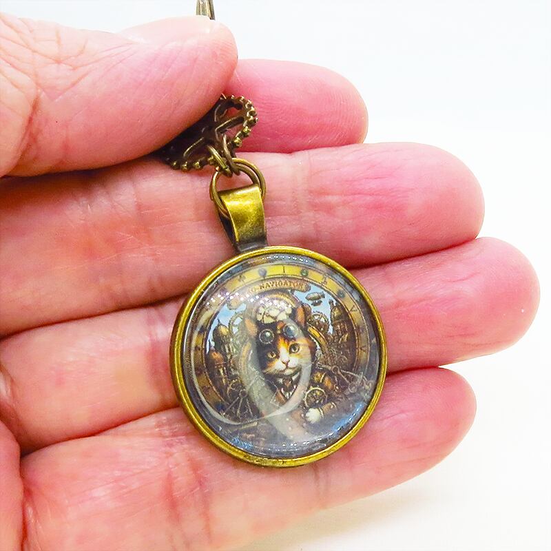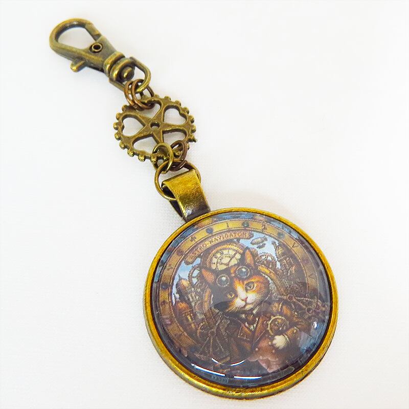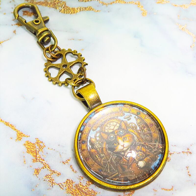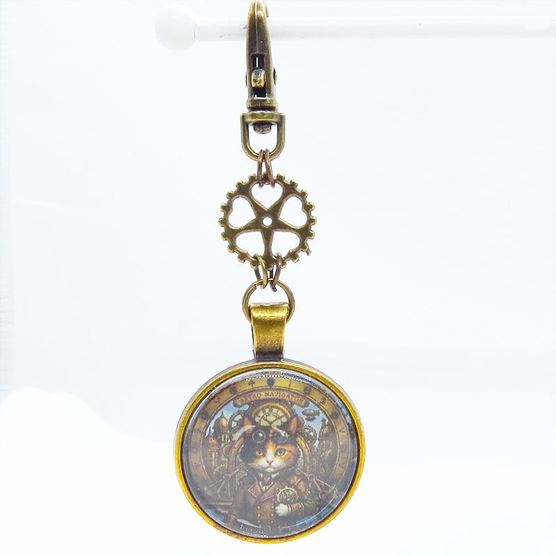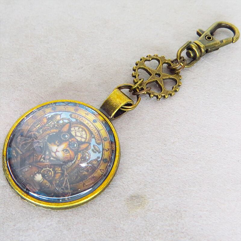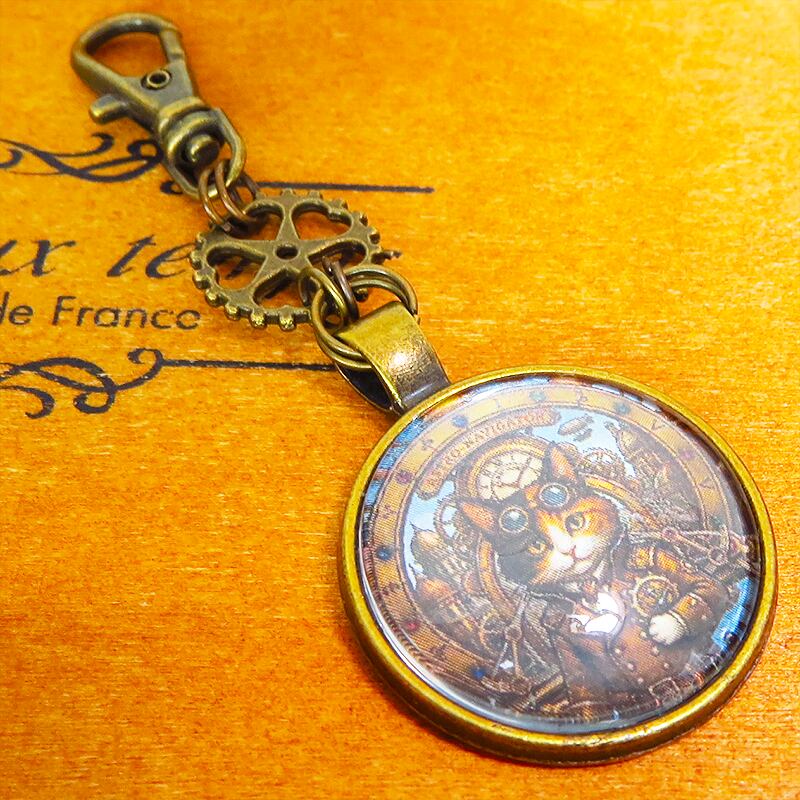 アンティークゴールド カボションペンダントキーホルダー スチームパンク 三毛猫パイロット 金具変更可