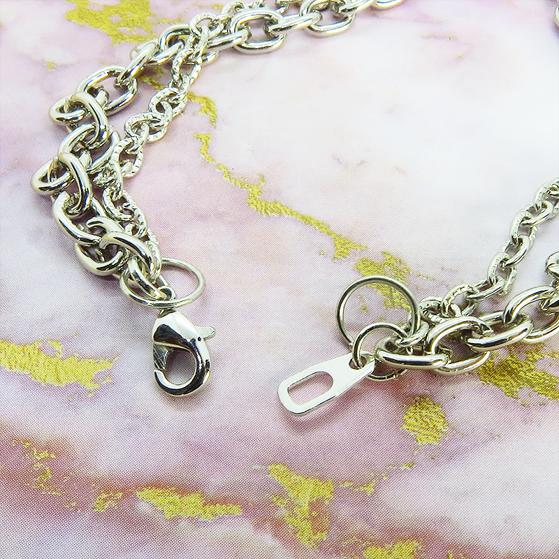 大小異なるダブルチェーンは、繊細さと力強さを兼ね備え、手首を美しく飾ります