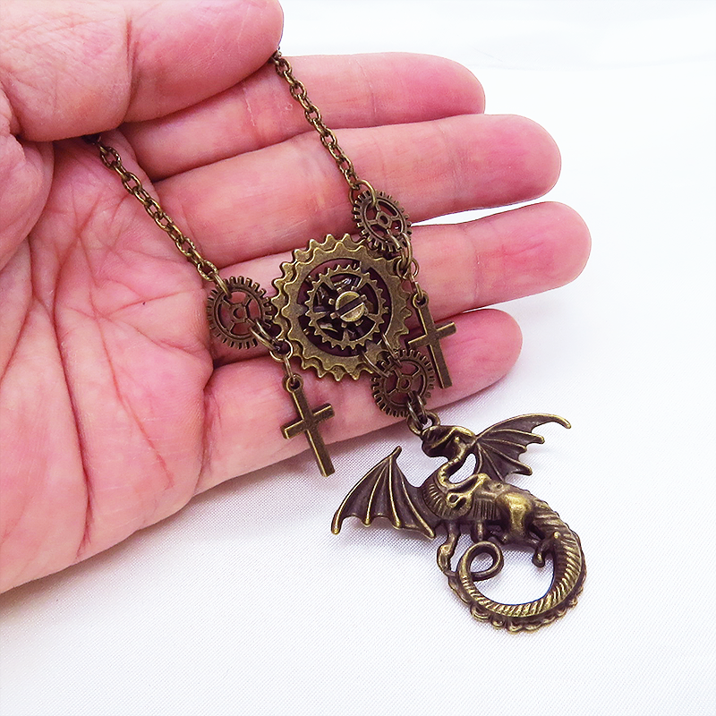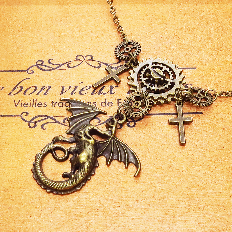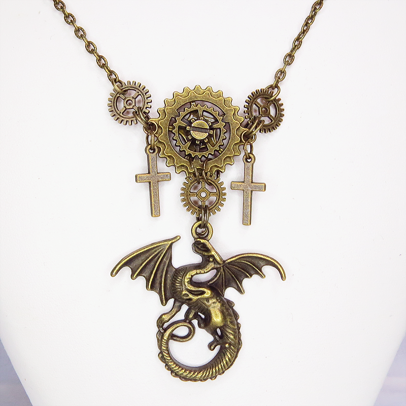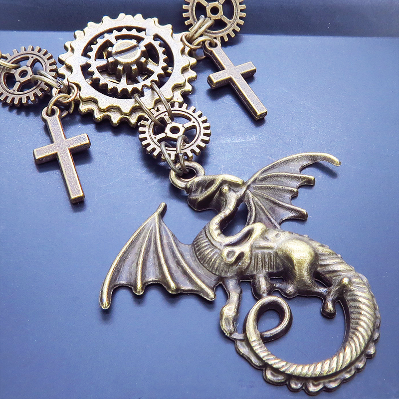 スチームパンク風のアンティークカラー(金古美色)のドラゴンと歯車のネックレスです