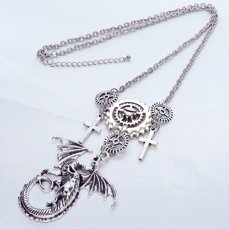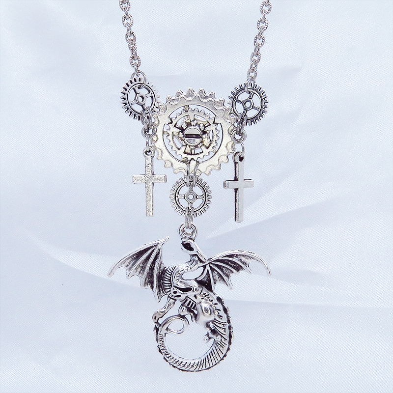 スチームパンク風のアンティークシルバー(銀古美色)のドラゴンと歯車のネックレスです