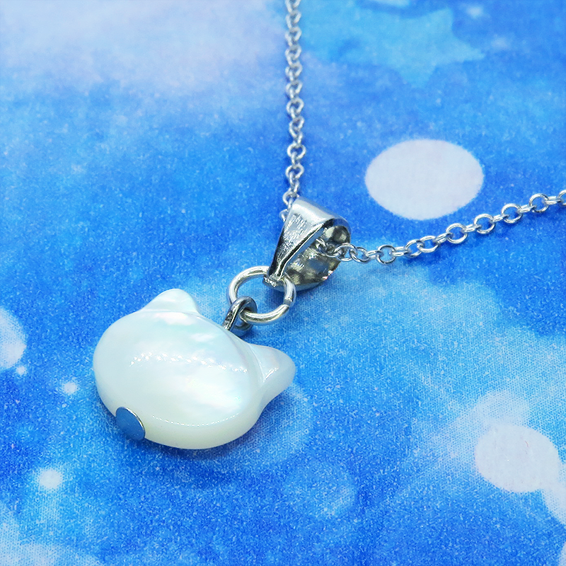 見る角度でキラキラと色が変化する白蝶貝(ホワイトマザーオブパール)は魅力的な輝きを胸元に演出します
