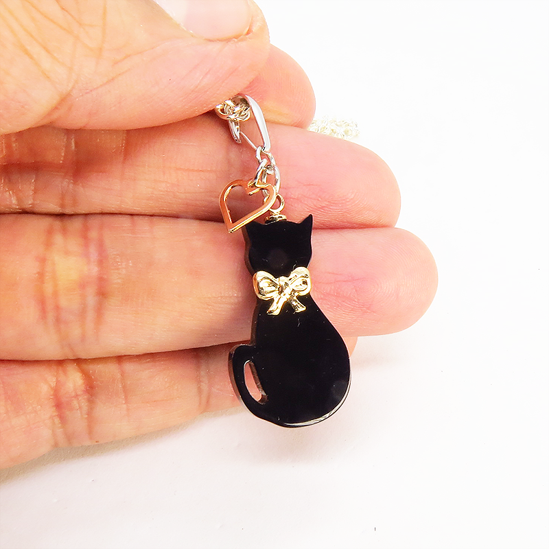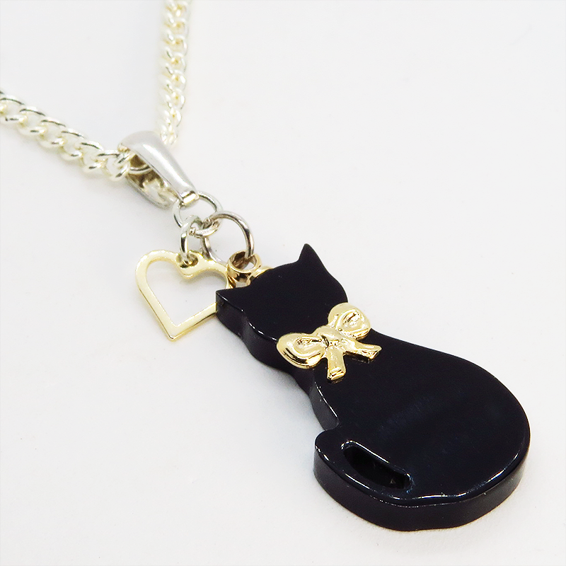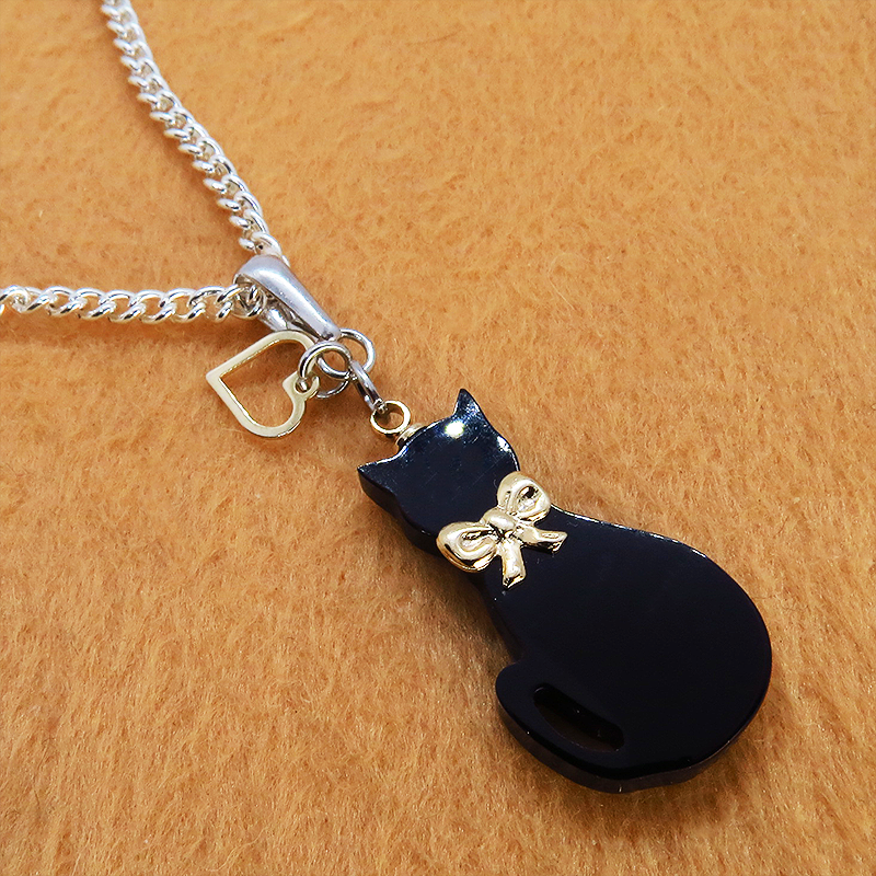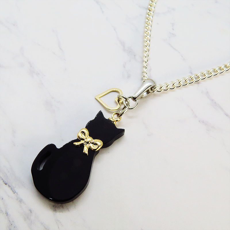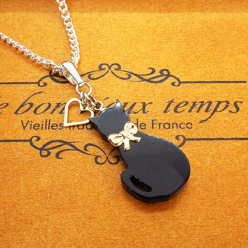 金色のリボンがついた黒猫シルエットモチーフの大人可愛いネックレスです