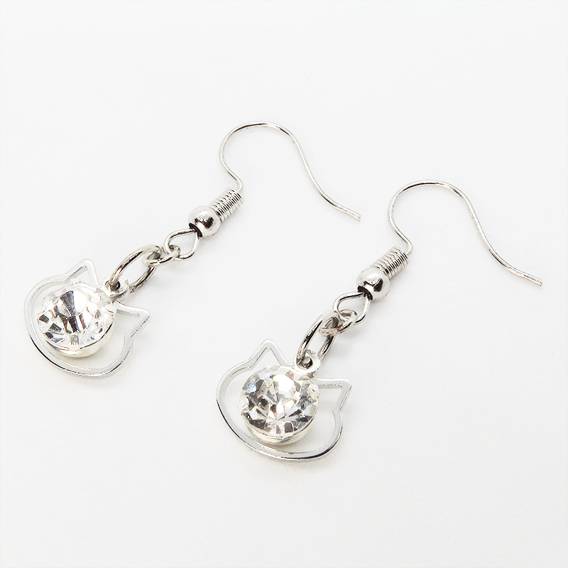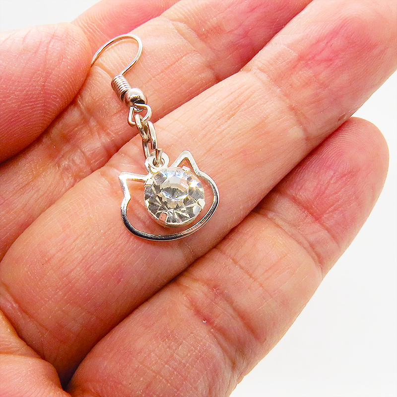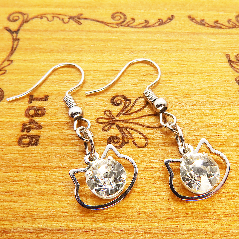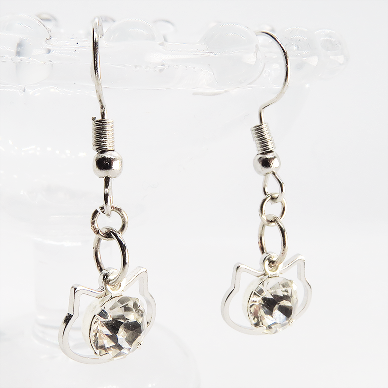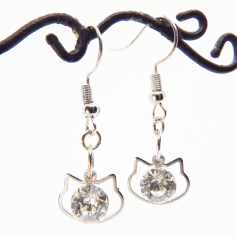 猫フェイスフレームのモチーフにキラキラ揺れて輝く大きめのラインストーンのフックピアスです