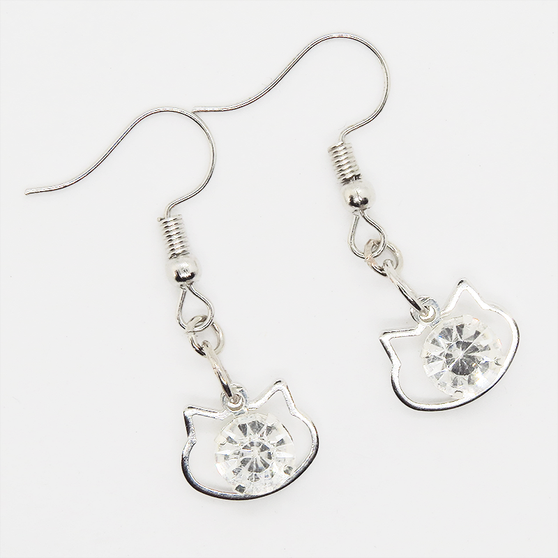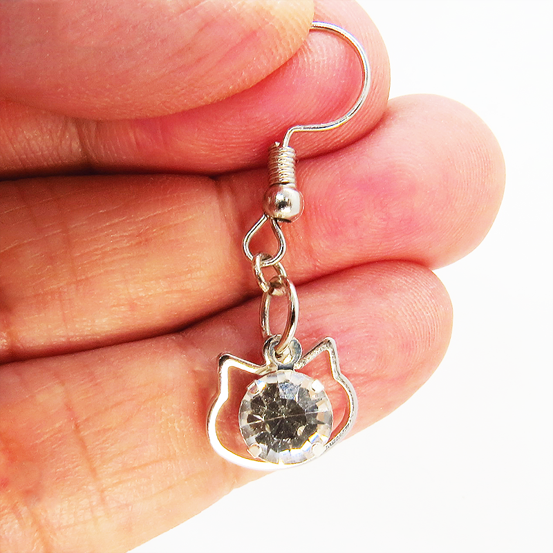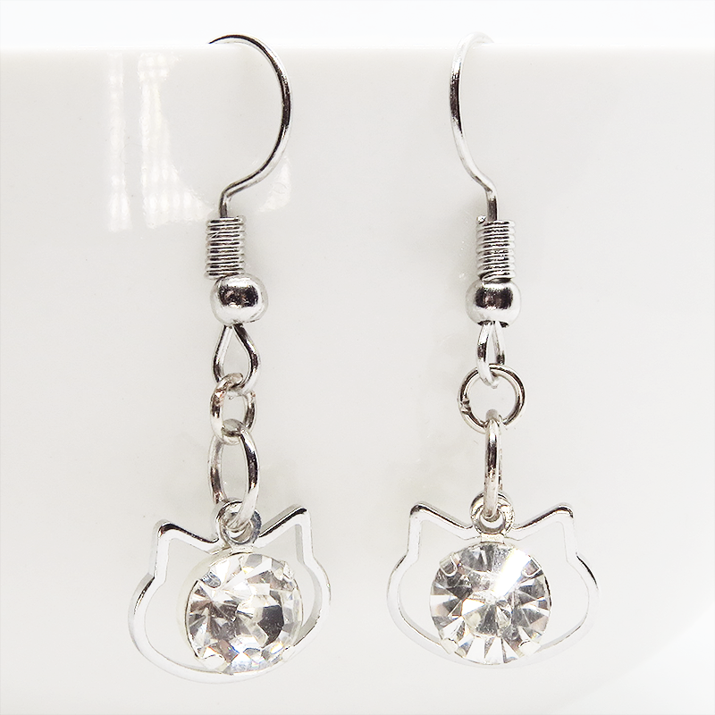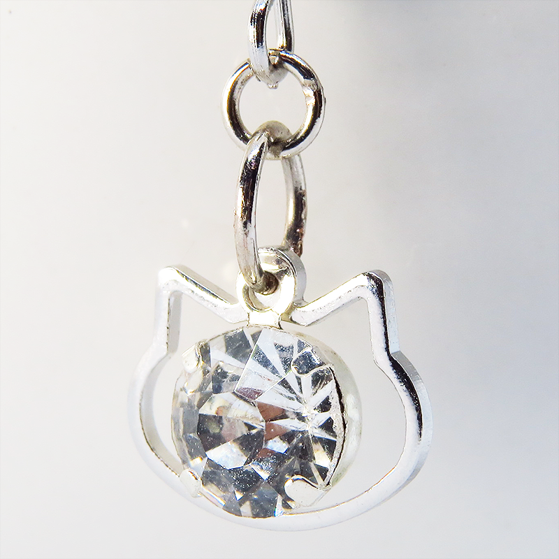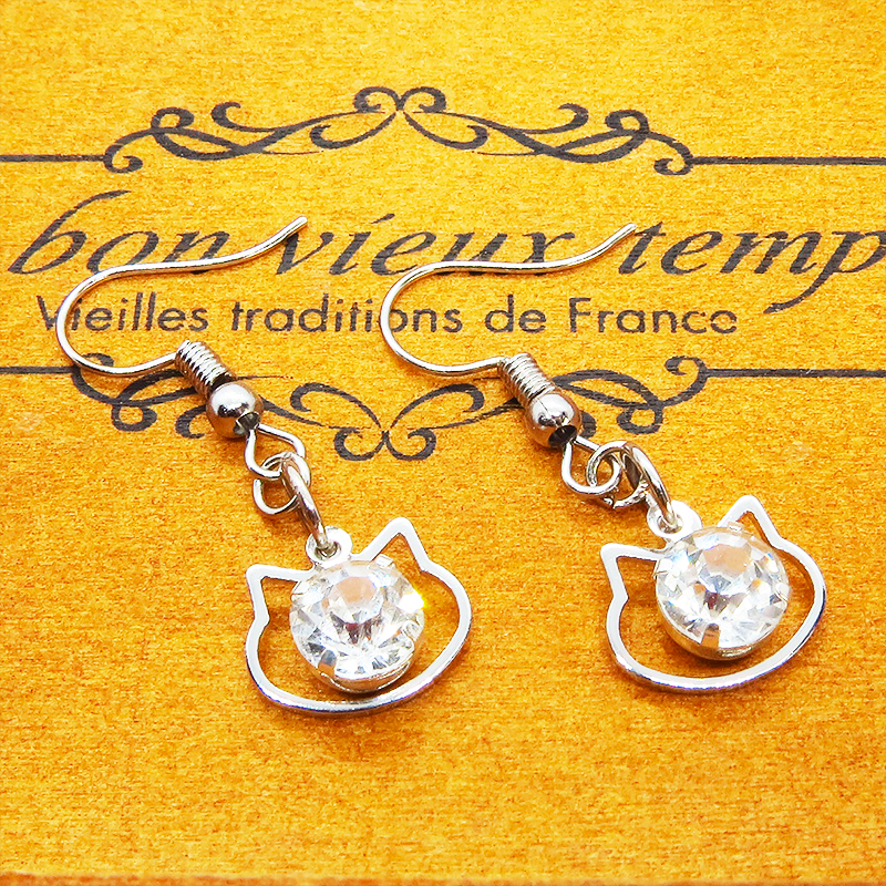 猫フェイスフレームのモチーフにキラキラ揺れて輝く大きめのラインストーンのフックピアスです