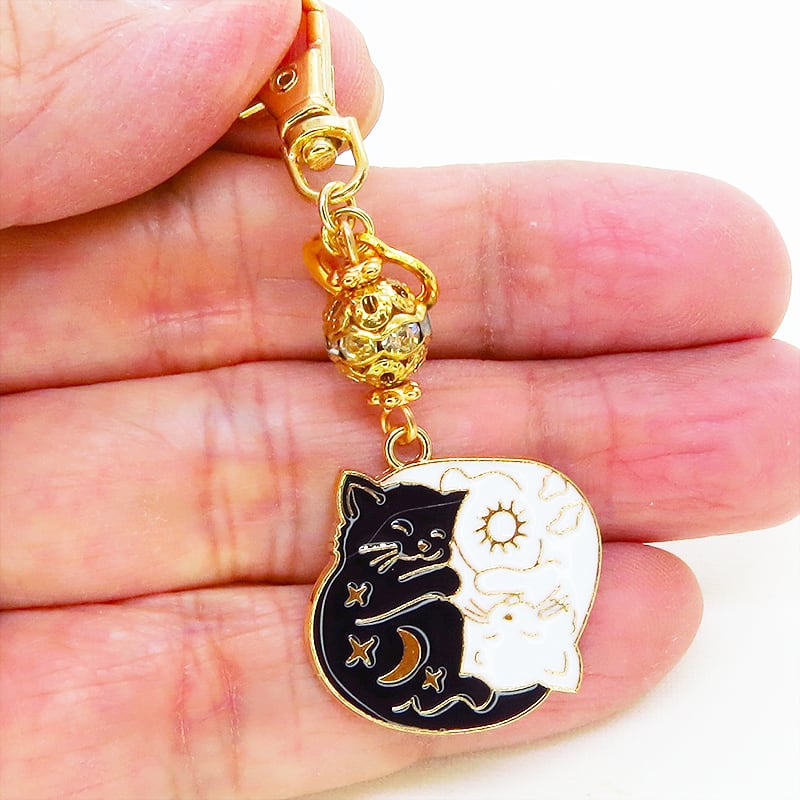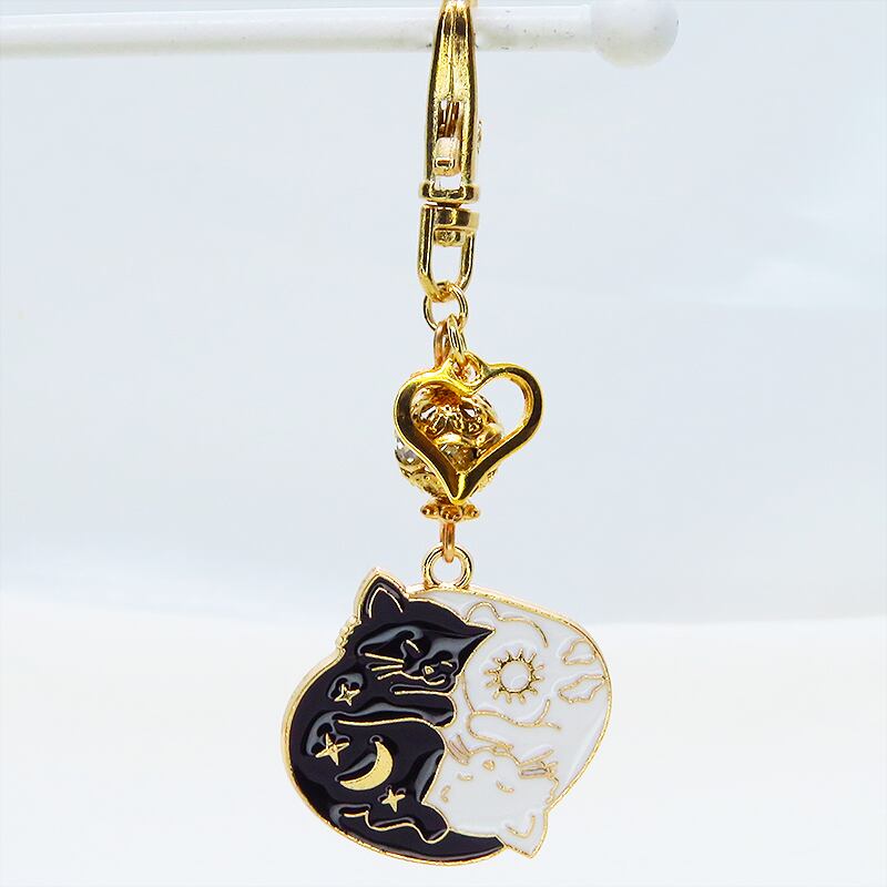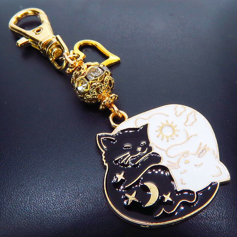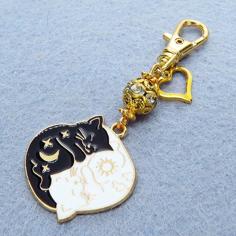 マットゴールドの輝きが上品な寄り添い眠る白猫と黒猫チャームのキーホルダーです